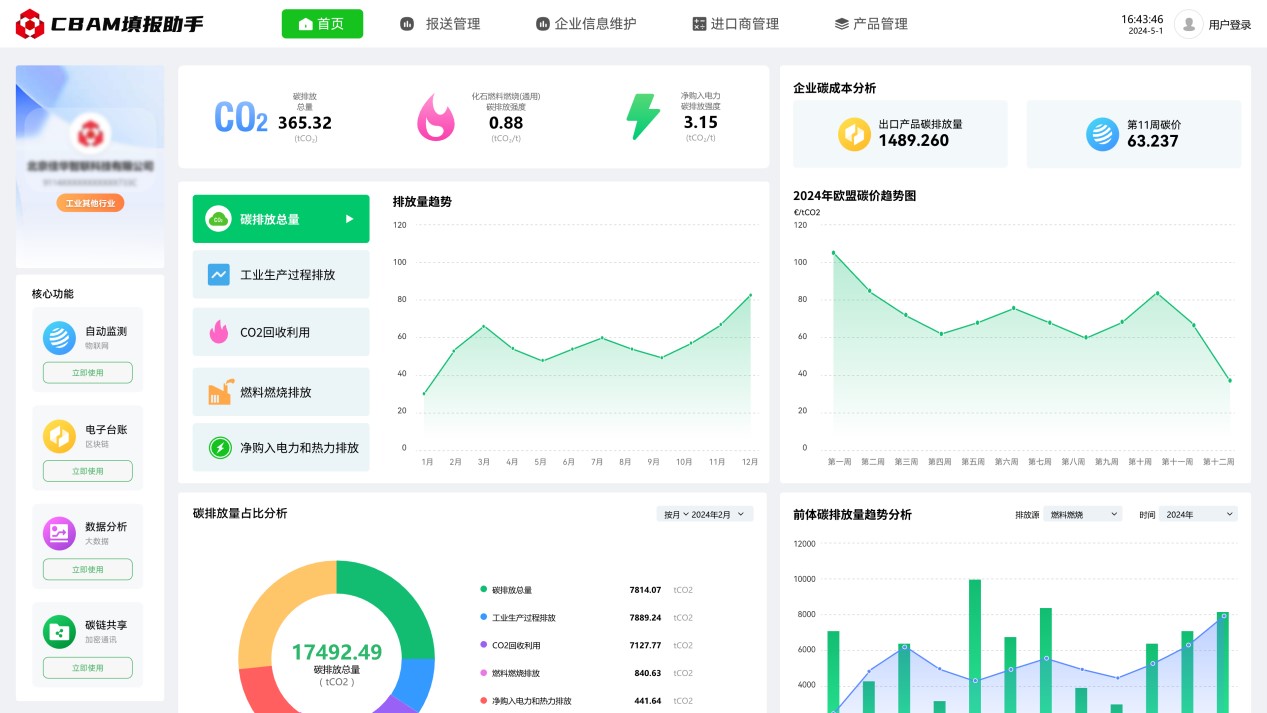 2023年10月1日起,歐盟碳邊境調整機制(CBAM)已進入過渡期,CBAM涵蓋范圍的出口產品需按時提交產品碳排放報告,未提交報告的企業將面臨高額處罰。為解決企業由于官方政策文件理解難度大,專業門檻高,數據搜集難度大,部分數據缺失無法填等困擾,推出碳關稅管理平臺(CBAM填報助手),通過數字化方式,為企業提供碳數據填報、碳數據核算、碳數據報送、碳數據認證、咨詢培訓等全流程服務。可極大減少企業碳排放報送門檻,助力企業低成本合規報送碳排放數據。